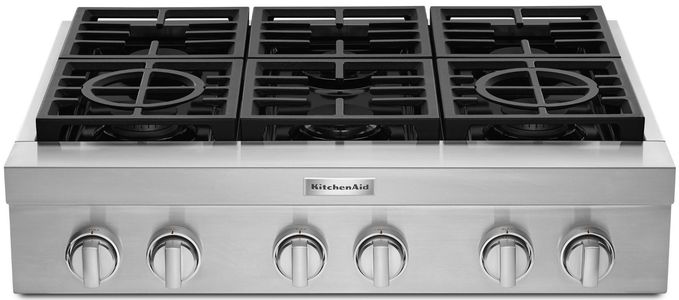 Expand your skills with a 36-inch KitchenAid® Commercial Style Rangetop with 6 burners. This gas cooktop offers power and precision to successfully sear, simmer, stir-fry and saute´. It features two 20,000 BTU Ultra Power™ Dual-Flame Burners for high- and low-heat cooking, a 5,000 BTU Simmer & Melt Burner perfect for small saucepans and three 15,000 BTU burners.Read More